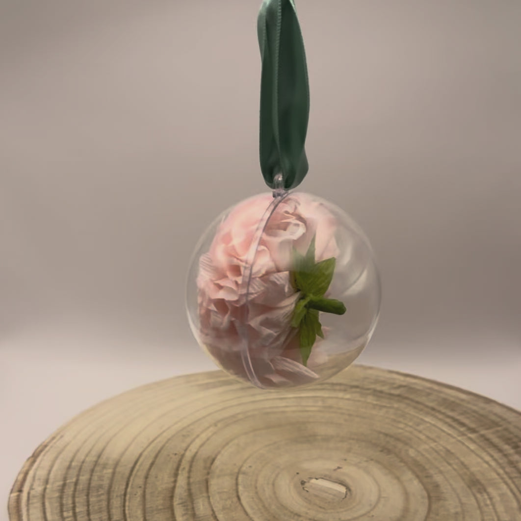 Die Kugel aus Acrylglas misst 8 cm im Durchmesser und beinhaltet eine unserer handgemachten Dahlienblüten aus Krepppapier. Alle Blüten sind handgemacht, wodurch es zu minimalen Abweichungen zum Produktfoto kommen kann.